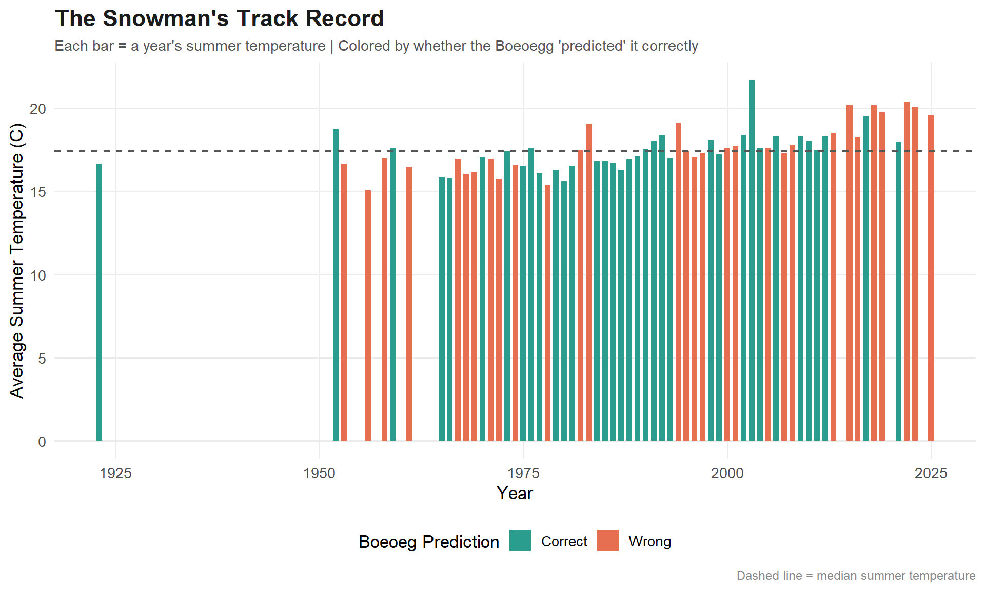 predictions_plot <- predictions %>%mutate(prediction_label =case_when( fast_burn & warm_summer ~"Fast burn, warm summer (correct)",!fast_burn &!warm_summer ~"Slow burn, cool summer (correct)", fast_burn &!warm_summer ~"Fast burn, cool summer (wrong)",!fast_burn & warm_summer ~"Slow burn, warm summer (wrong)" ),outcome =ifelse(correct, "Correct", "Wrong") )pred_cols <-c("Correct"="#2A9D8F", "Wrong"="#E76F51")ggplot(predictions_plot, aes(x = year, y = tre200m0, fill = outcome)) +geom_col(width =0.7) +geom_hline(yintercept =median(analysis_data$tre200m0),linetype ="dashed",color ="#555555" ) +scale_fill_manual(values = pred_cols, name ="Boeoeg Prediction") +labs(title ="The Snowman's Track Record",subtitle ="Each bar = a year's summer temperature | Colored by whether the Boeoegg 'predicted' it correctly",x ="Year",y ="Average Summer Temperature (C)",caption ="Dashed line = median summer temperature" ) +theme_minimal(base_size =13) +theme(plot.title =element_text(face ="bold", size =17, color ="#1B1B1B"),plot.subtitle =element_text(size =11, color ="#555555"),plot.caption =element_text(size =9, color ="#888888"),legend.position ="bottom",panel.grid.minor =element_blank() )