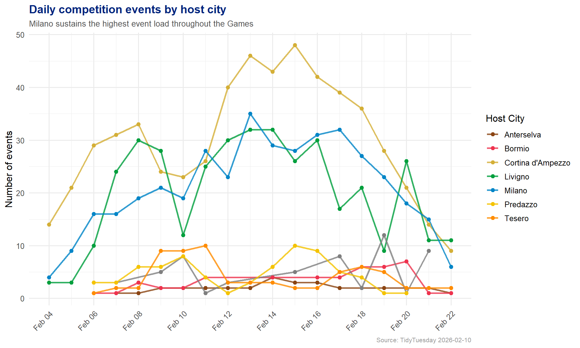 city_daily <- schedule %>%filter(!is_training) %>%count(date, host_city, name ="events")city_colors <-c("Milano"="#0085C7","Cortina d'Ampezzo"="#D4AF37","Livigno"="#009F3D","Bormio"="#EE334E","Predazzo"="#F4C300","Tesero"="#FF8C00","Anterselva"="#8B4513")ggplot(city_daily, aes(x = date, y = events, color = host_city)) +geom_line(linewidth =1, alpha =0.8) +geom_point(size =2) +scale_color_manual(values = city_colors, name ="Host City") +scale_x_date(date_breaks ="2 days", date_labels ="%b %d") +labs(title ="Daily competition events by host city",subtitle ="Milano sustains the highest event load throughout the Games",x =NULL,y ="Number of events",caption ="Source: TidyTuesday 2026-02-10" ) +theme_minimal(base_size =12) +theme(plot.title =element_text(face ="bold", size =14, color ="#00247D"),plot.subtitle =element_text(size =10, color ="#555555"),plot.caption =element_text(size =8, color ="#999999"),axis.text.x =element_text(angle =45, hjust =1),legend.position ="right" )